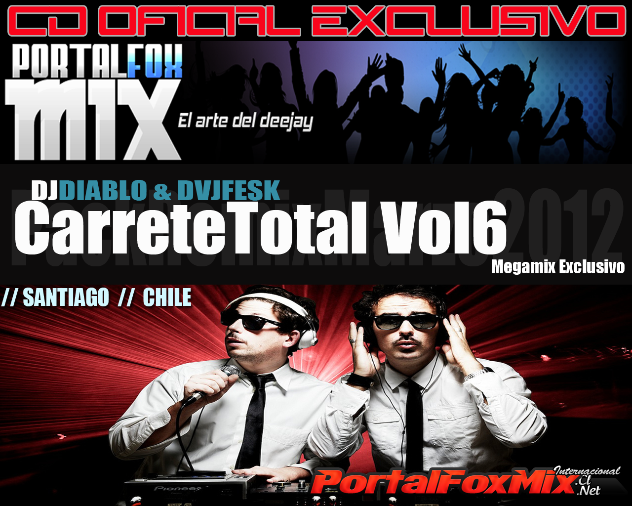 Aqui tenemos para los fanaticos de los megamix o sessiones de larga duraccion el CARRETE TOTAL VOLUMEN 6 BY DJ DIABLO desde Santiago de Chile para todo el mundo, esta saga ya es reconocida mundialmente por todos y esta muy bien creada, con divertos ritmos y temas que haran bailar hasta a los muertos, aqui el carrete total vol 6 empieza el año 2012 con este SUPER BAILABLE que muchos ya conocen, y los que no lo conocen ahora es su gran oportunidad. Agradecimientos especiales a nuestro cumpita DJ DIABLO por su material.